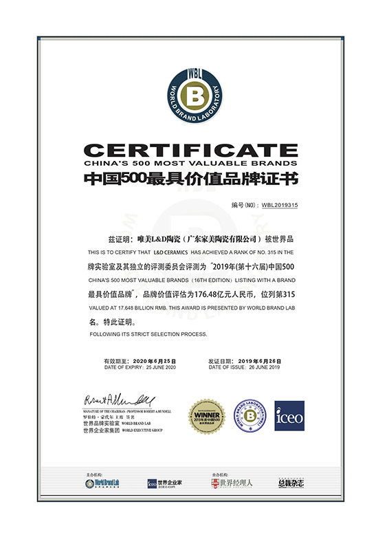 2011年,唯美L&D陶瓷榮獲“2011年中國500價值品牌”;